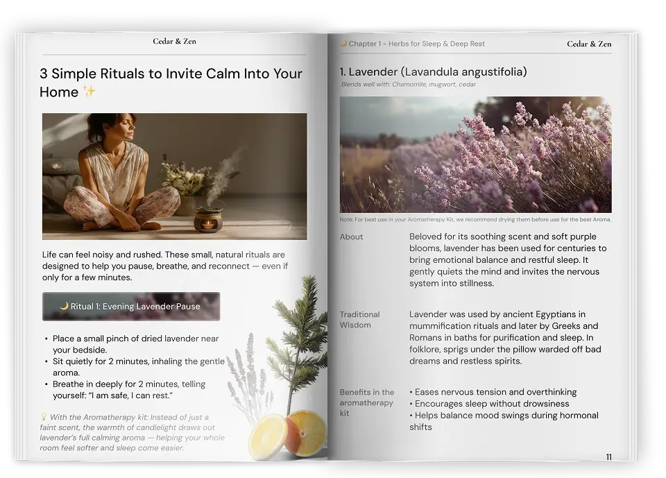 Need deep sleep? The guide shows you the perfect cedar-lavender blend. Want morning clarity? There's a rosemary-eucalyptus combination. Feeling anxious? Learn the calming chamomile ritual.